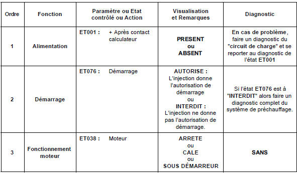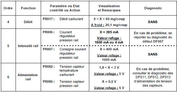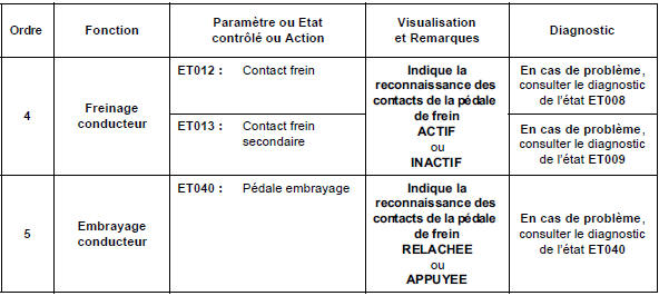 N'effectuer ce contrôle de conformité qu'après un contrôle complet avec l'outil de diagnostic. Les valeurs indiquées dans ce contrôle de conformité ne sont données qu'à titre indicatif. Condition d'exécution : moteur arrêté sous contact.