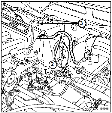 - Débrancher le tuyau de dépression (2) de l'amplificateur de freinage du répartiteur d'admission.